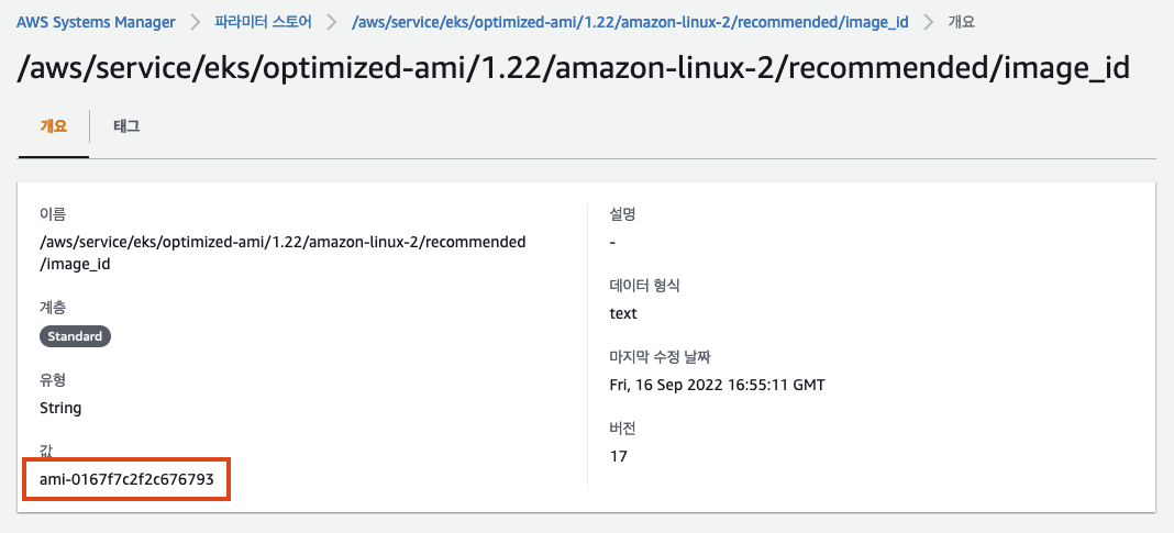 ㅇ EKS 1.22에 최적화된 ami-0167f7c2f2c676793 값을 찾았다.