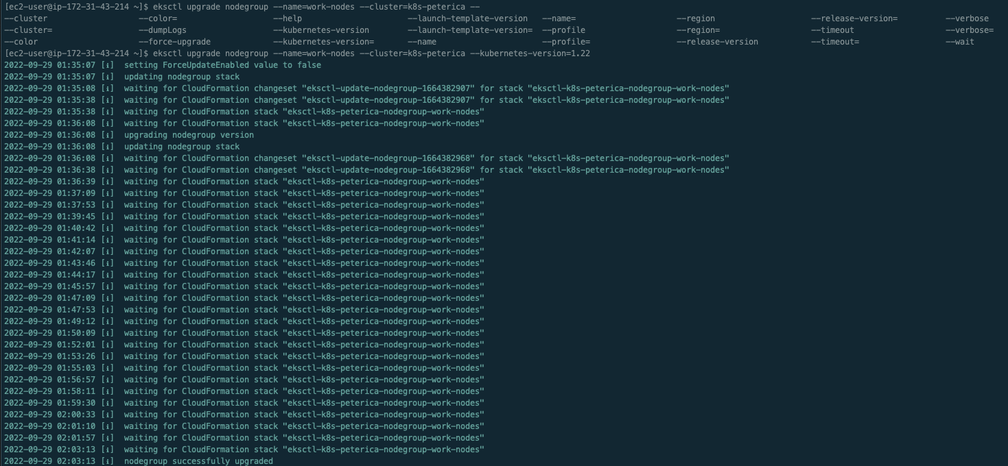 eksctl upgrade nodegroup --name=work-nodes --cluster=k8s-peterica --kubernetes-version=1.22