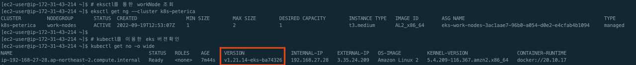 ip-192-168-27-28.ap-northeast-2.compute.internal Ready <none> 7m44s v1.21.14-eks-ba74326 192.168.27.28 3.35.24.209 Amazon Linux 2 5.4.209-116.367.amzn2.x86_64 docker://20.10.17