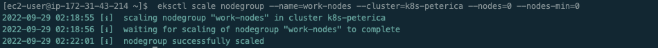 [ec2-user@ip-172-31-43-214 ~]$ eksctl scale nodegroup --name=work-nodes --cluster=k8s-peterica --nodes=0 --nodes-min=0