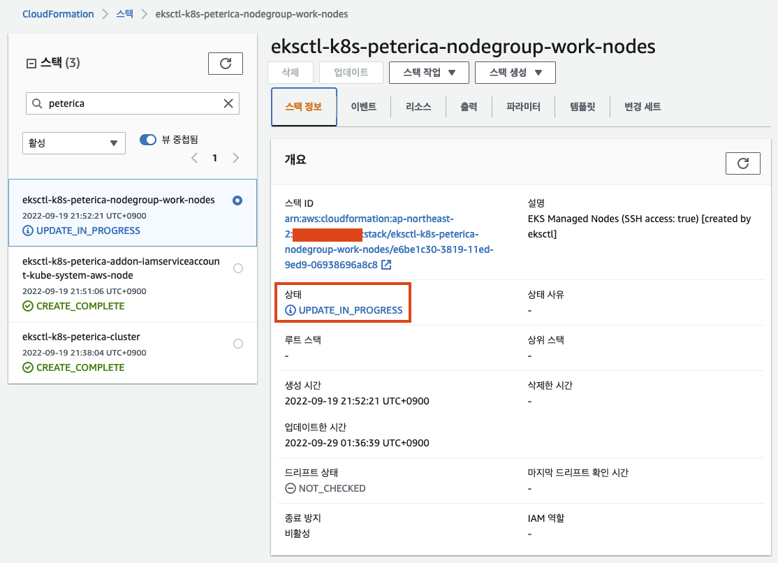 ㅇ 실행하자 상태가 UPDATE_IN_PROGRESS로 변경되었다.