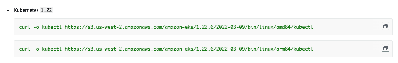 Amazon EKS 클러스터 제어 영역과 마이너 버전이 하나 다른 kubectl 버전을 사용해야 합니다. 예를 들어 1.22 kubectl