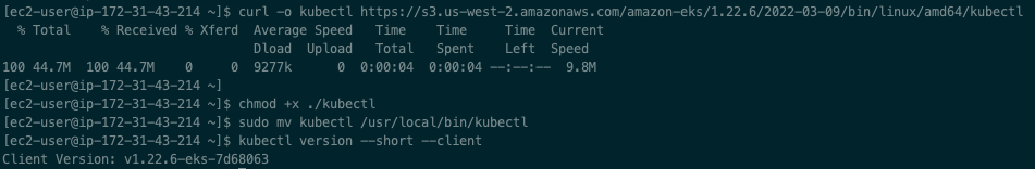 [ec2-user@ip-172-31-43-214 ~]$ curl -o kubectl https://s3.us-west-2.amazonaws.com/amazon-eks/1.22.6/2022-03-09/bin/linux/amd64/kubectl