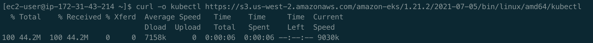[ec2-user@ip-172-31-43-214 ~]$ curl -o kubectl https://s3.us-west-2.amazonaws.com/amazon-eks/1.21.2/2021-07-05/bin/linux/amd64/kubectl