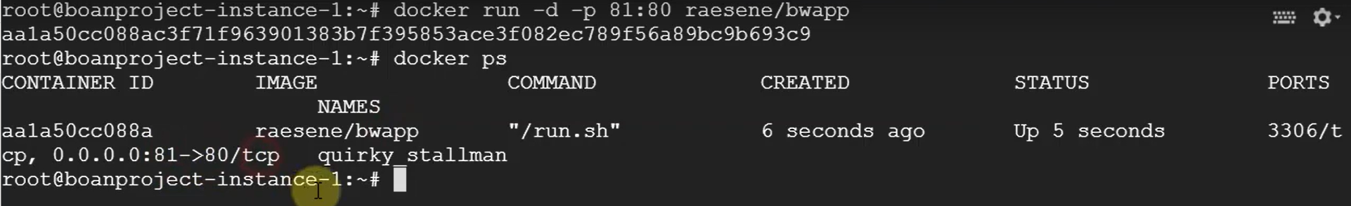 - docker run -d -p 81:80 raesene/bwapp (서버 포트:도커 내부포트)
