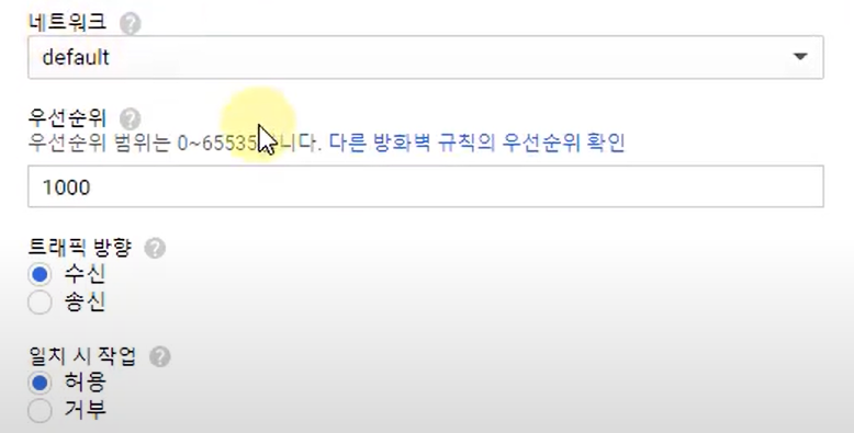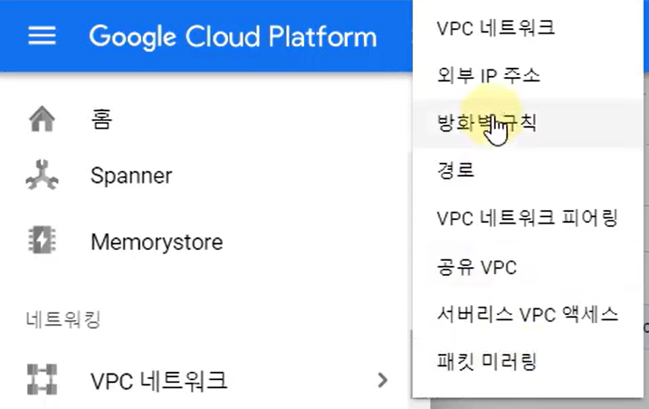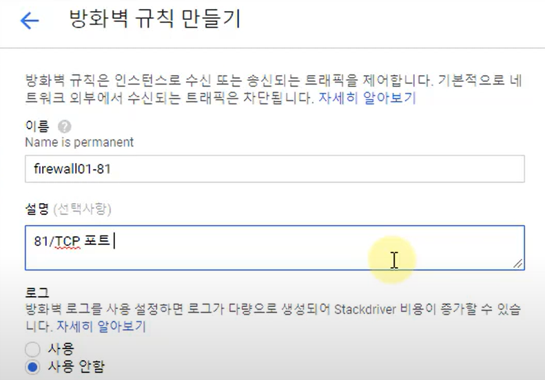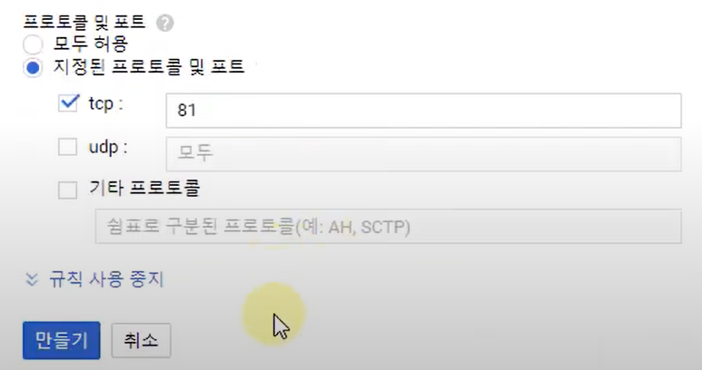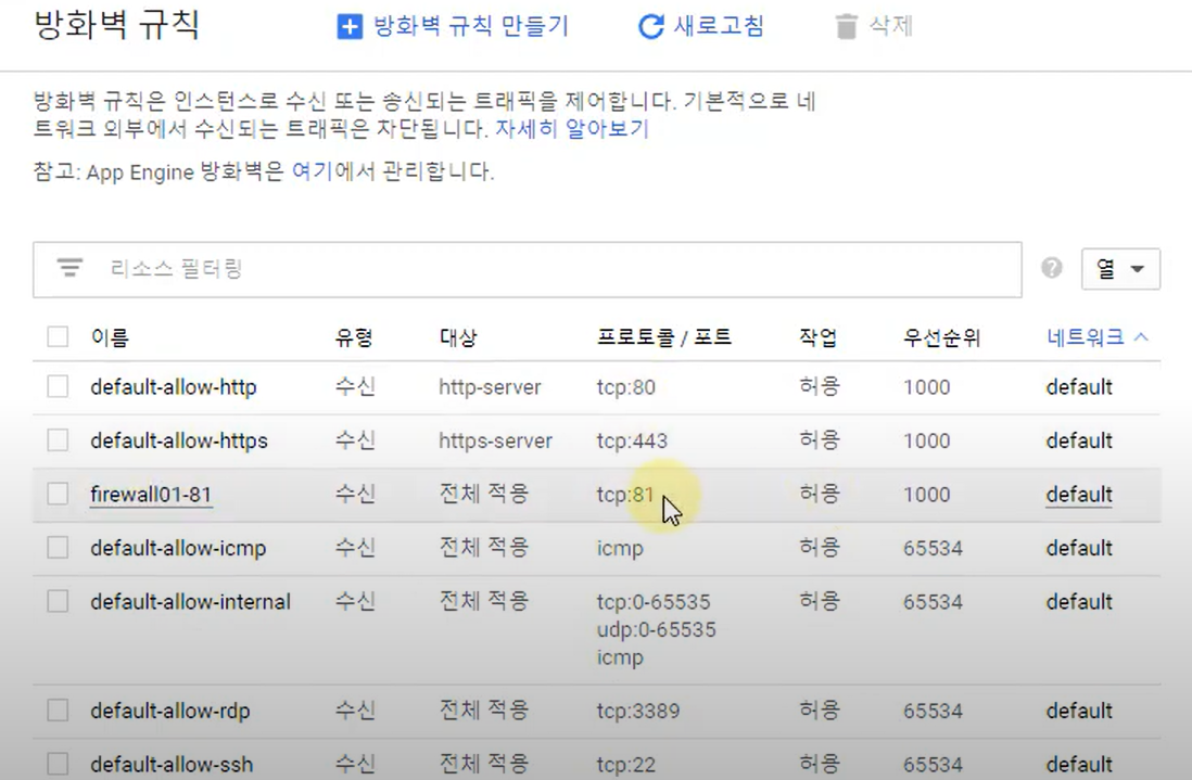 - VPC네트워크 --> 방화벽 규칙 --> 방화벽 규칙 만들기