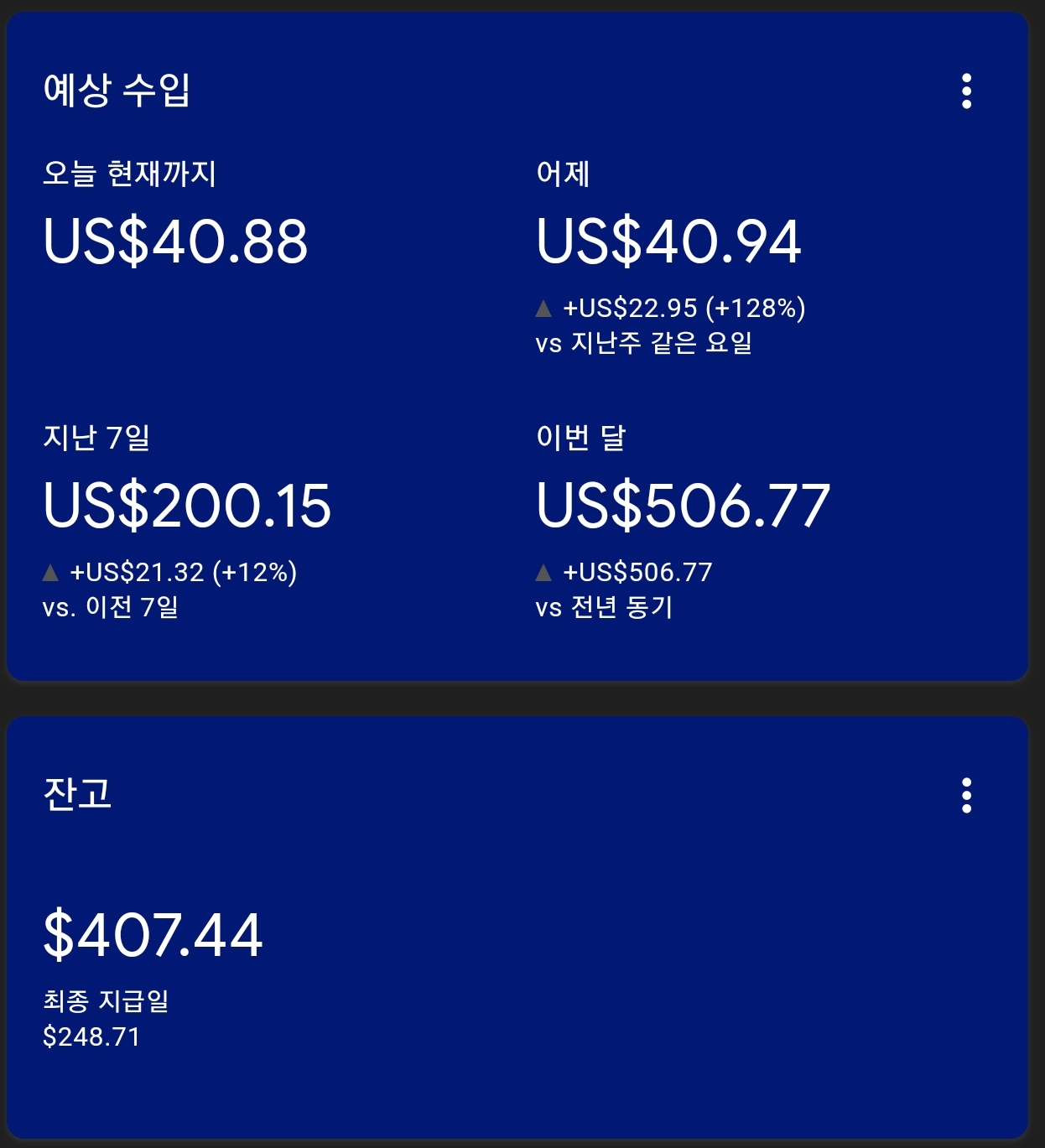 | [12/22][역행자 동기부여] 블로그 성장기 애드핏&애드센스 수익 !! (47) | 2023.12.22 |