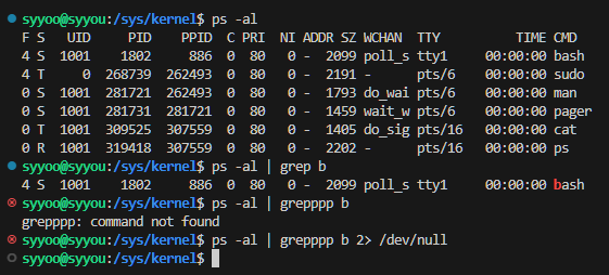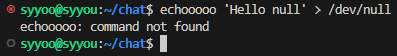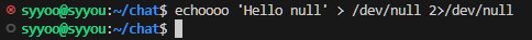 두 번째echooo 'Hello null' > /dev/null 2>&1에서 일단 2>&1 의 의미는 2(stderr)를 1(stdout)으로 redirect 시키는 것으로 1앞에 &가 붙은 이유는 그냥 1을 쓰면 파일이름이 1인 것으로 인식하지만 &1을 하면 File Descriptor의 1번, 즉 stdout을 가리키는 뜻이다.