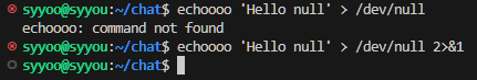 두 번째echooo 'Hello null' > /dev/null 2>&1에서 일단 2>&1 의 의미는 2(stderr)를 1(stdout)으로 redirect 시키는 것으로 1앞에 &가 붙은 이유는 그냥 1을 쓰면 파일이름이 1인 것으로 인식하지만 &1을 하면 File Descriptor의 1번, 즉 stdout을 가리키는 뜻이다.