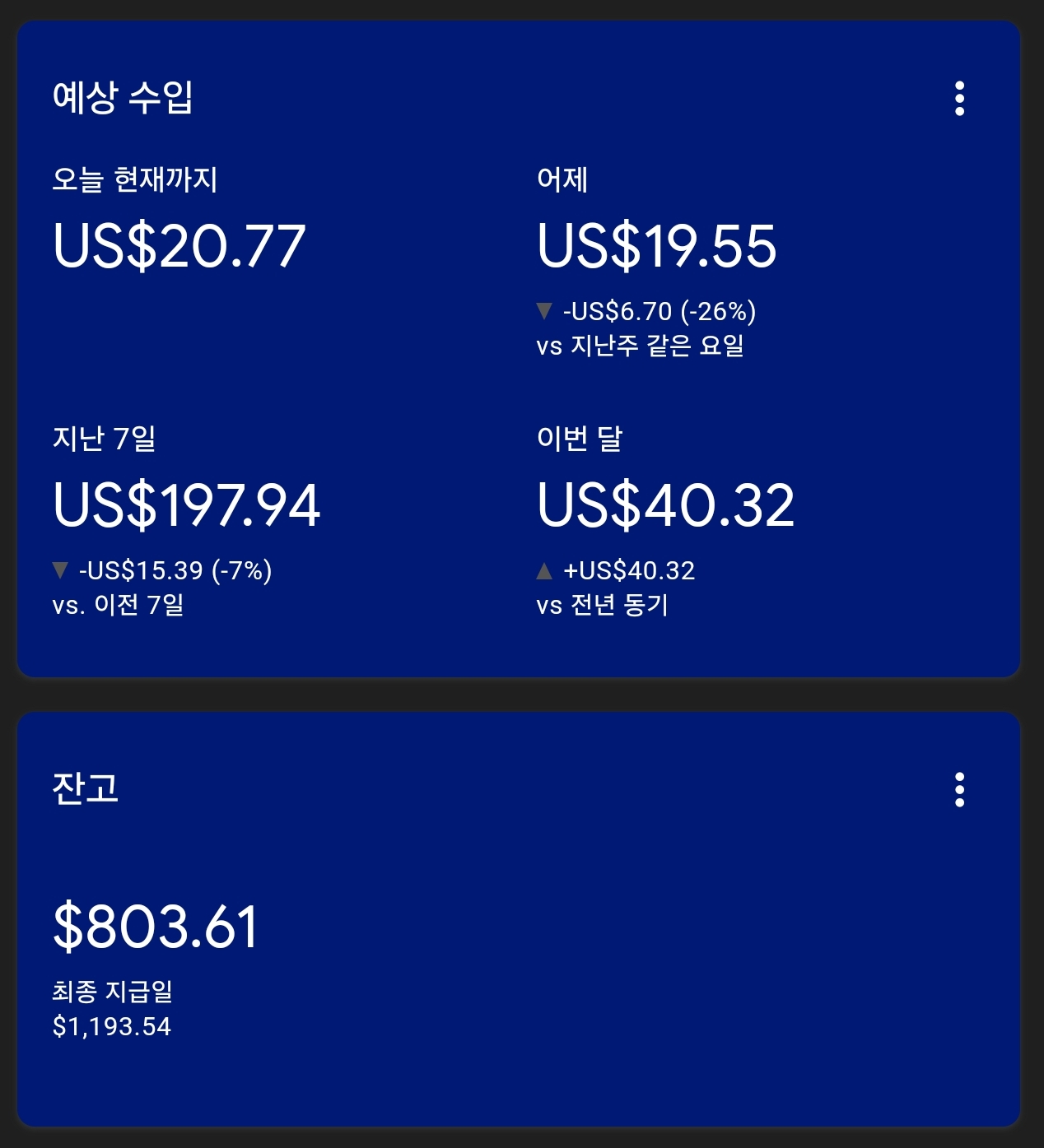 | [3/6][역행자 동기부여][US $155 돌파!!] 애드핏&애드센스 수익 !! (74) | 2024.03.06 |
