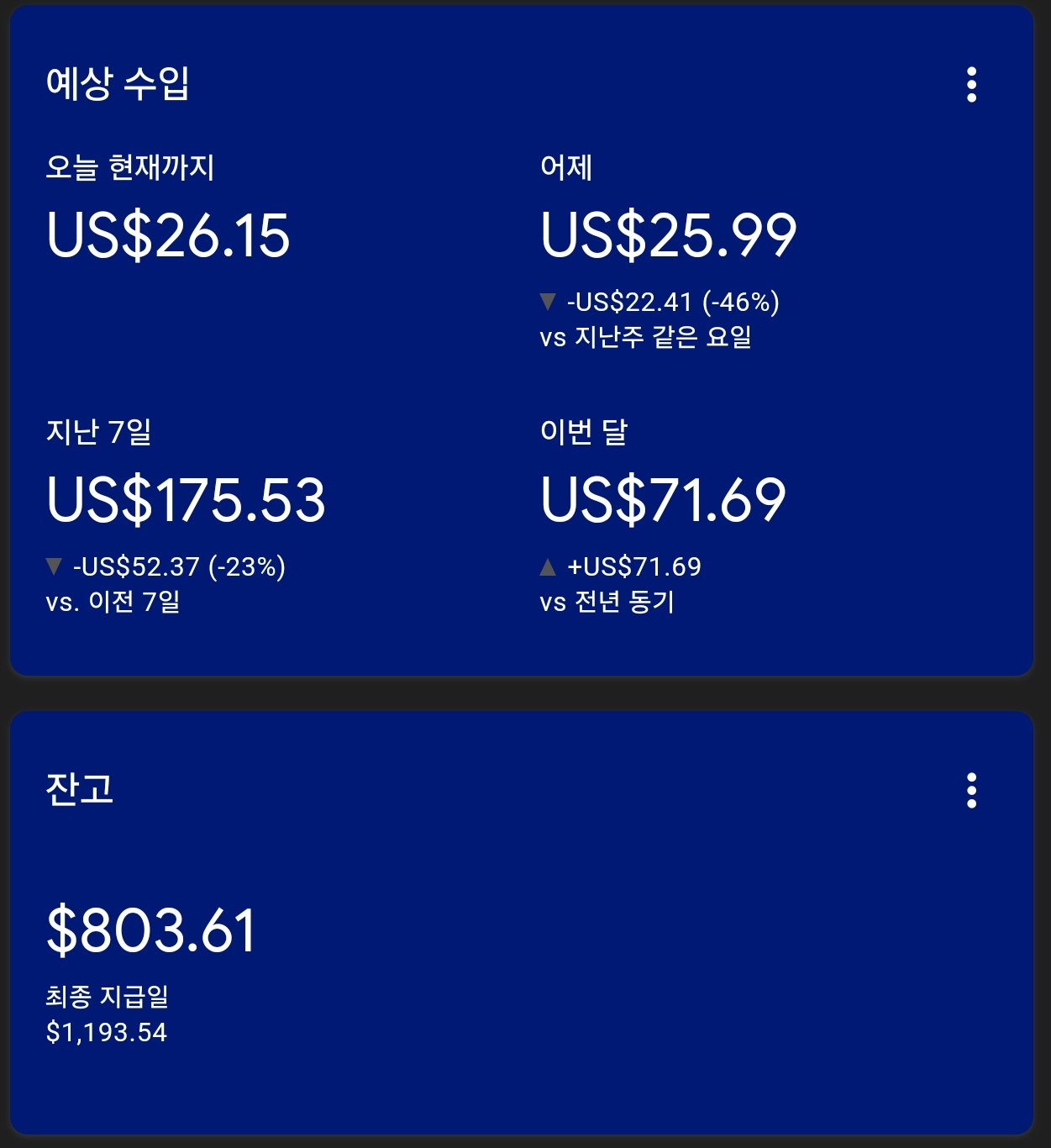 | [3/6][역행자 동기부여][US $155 돌파!!] 애드핏&애드센스 수익 !! (74) | 2024.03.06 |