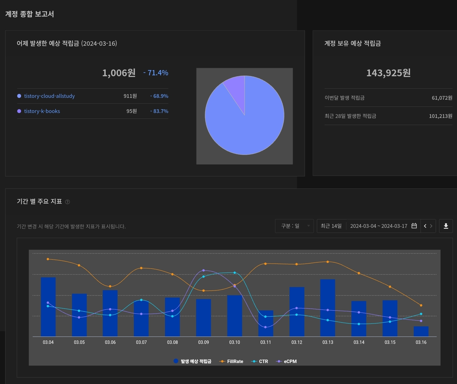 | [인터넷건물주 - 3월 월세] US $409 돌파 - AdFit & AdSense - 3/15일!! (60) | 2024.03.15 |
