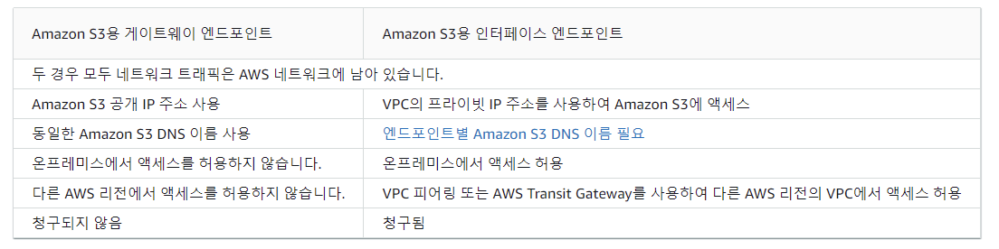 게이트웨이 엔드포인트 와 인터페이스 엔드포인트 (AWS PrivateLink 사용) 라는 두 가지 유형의 VPC 엔드포인트를 사용하여 Amazon S3에 액세스할 수 있습니다 . 게이트웨이 엔드포인트 는 AWS 네트워크를 통해 VPC에서 Amazon S3에 액세스하기 위해 라우팅 테이블에 지정하는 게이트웨이입니다 . 인터페이스 엔드포인트 는 프라이빗 IP 주소를 사용하여 VPC 피어링 또는 AWS Transit Gateway를 사용하여 VPC 내, 온프레미스 또는 다른 AWS 리전의 VPC에서 Amazon S3로 요청을 라우팅함으로써 게이트웨이 엔드포인트의 기능을 확장합니다. 자세한 내용 은 VPC 피어링이란 무엇 이며 Transit Gateway vs VPC 피어링 을 참조하십시오 .