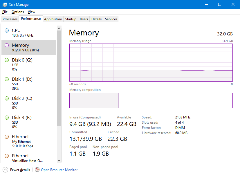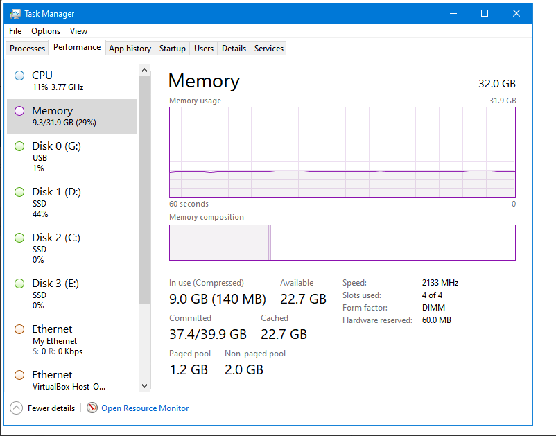 Resource Monitor나 Task Manager를 살펴봐도 딱히 메모리를 잡아먹는 프로세스가 없었다.