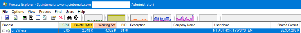 Committed 부분이 즉시 정상으로 돌아왔다. 이 프로그램 혼자서 24.3GB를 할당을 받은건데, shared commit으로 잡아 놔서 보통 보게 되는 private bytes나 working set에는 별다른 문제가 없는 것처럼 보인다.