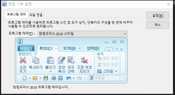 한컴 오피스 한글 2010 설치가 끝나면 기본 설정을 진행할 수 있습니다. 기본 설정에서는 프로그램 테마를 선택이 가능하며, 구버전의 테마가 익숙한 사용자에게 좋은 설정입니다.