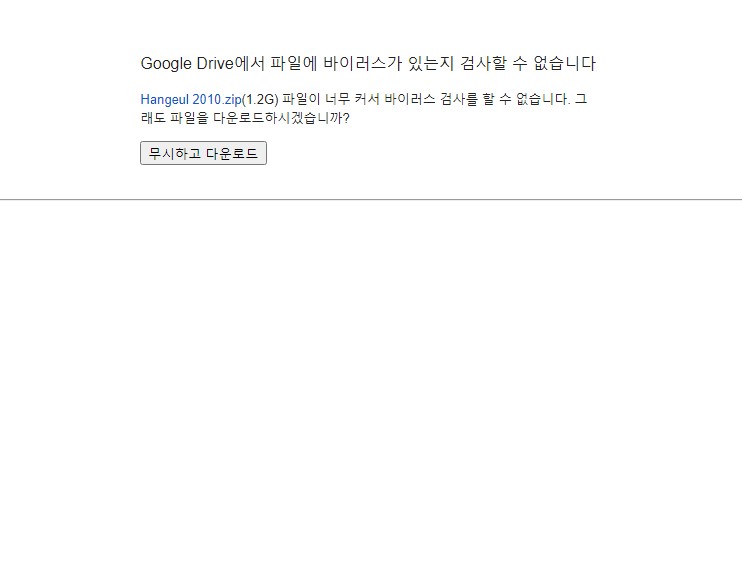 들어가면 1.2gb 상당에 용량을 가진 한글 2010 압축 파일이 있습니다. 파일이 커서 바이러스 검사를 못 한다는 애기가 있지만 필자가 다운로드하여 사용할 정도로 안전한 파일이니 '무시하고 다운로드'버튼을 클릭해서 압축된 설치 파일을 받습니다.
