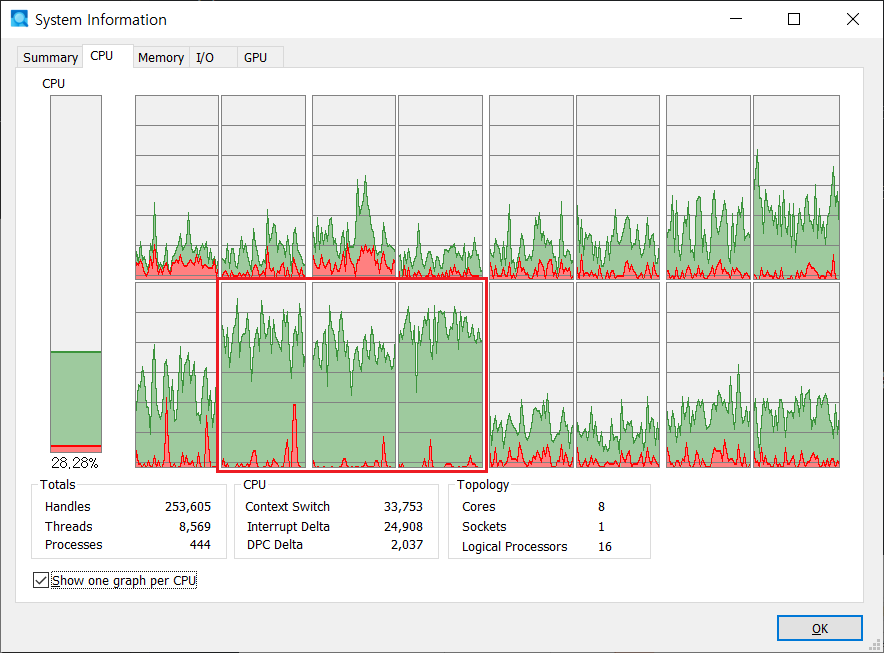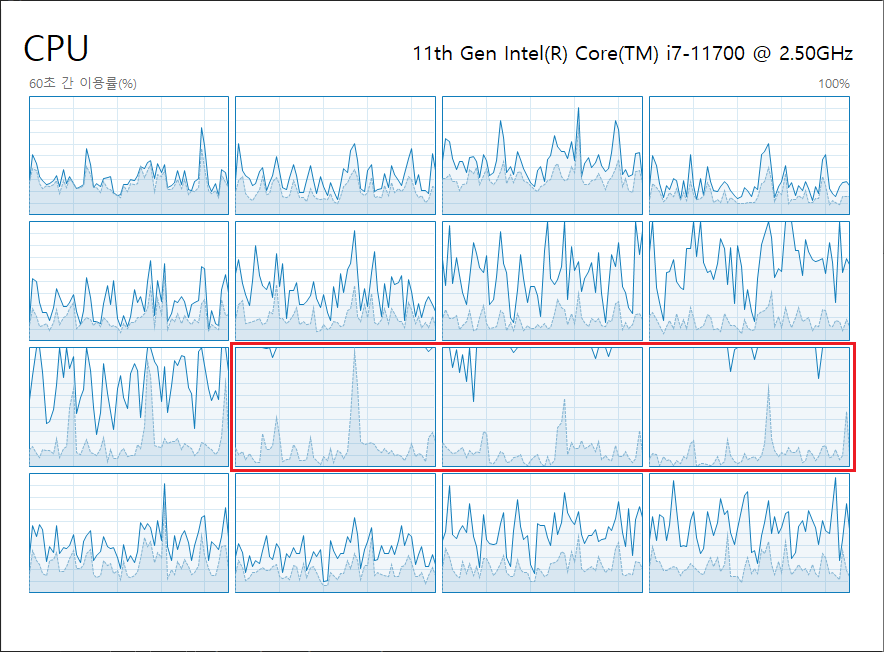 서두에서 설명한 대로 Windows 작업 관리자의 [성능] 탭에서 표시되는 CPU 이용률은 CPU 활용률(Utilization)를 의미합니다. 따라서 CPU 코어 사용량(Usage)을 모니터링하기 위해서는Process Explorer,System Informer등과 같은 OSS/서드파티 프로그램을 사용해야 합니다.