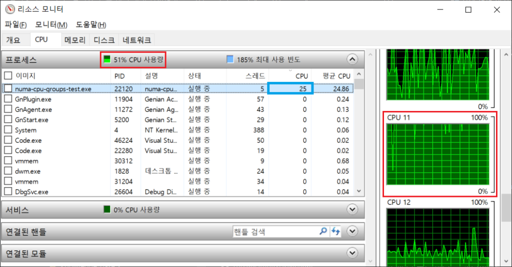 Windows 리소스 모니터(Resource Monitor)의 [CPU] 탭에서 표시되는 프로세스 전체 CPU 이용률과 우측 패널의 CPU 이용률은 CPU 활용률(Utilization)을 의미하지만, 프로세스 뷰의 CPU 칼럼에서 표시되는 CPU 이용률은 CPU 사용량(Usage)을 의미합니다.