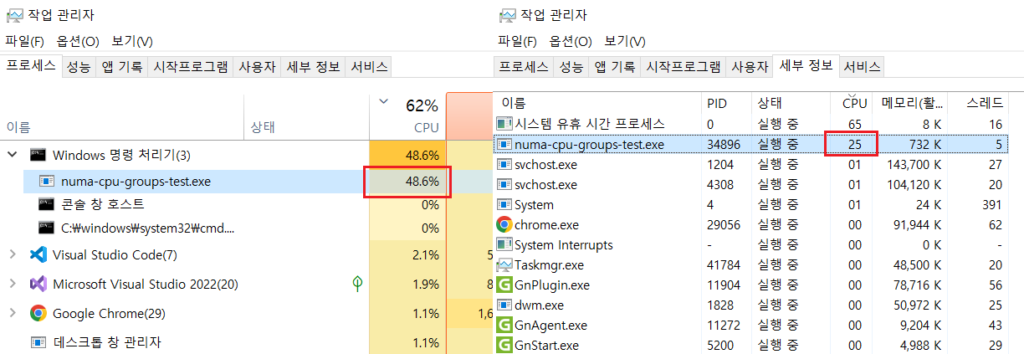 작업 관리자의 [프로세스] 탭과 [세부 정보] 탭의 CPU 이용률 비교