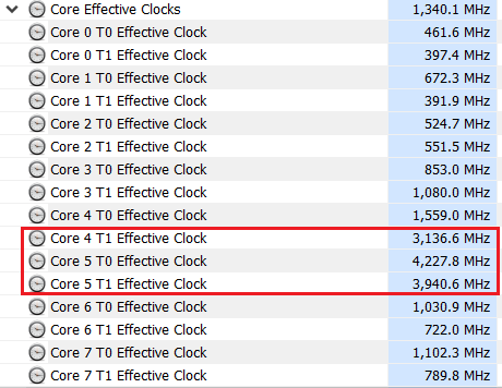 논리 프로세서의 유효 주파수작업 관리자의 CPU 코어 활용률과 논리 프로세서의 유효 주파수 비교