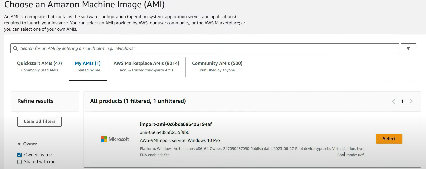 - Browse more AMIs 클릭 ==> My AMIs 선택