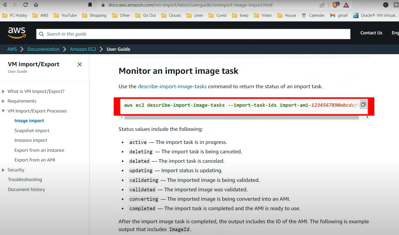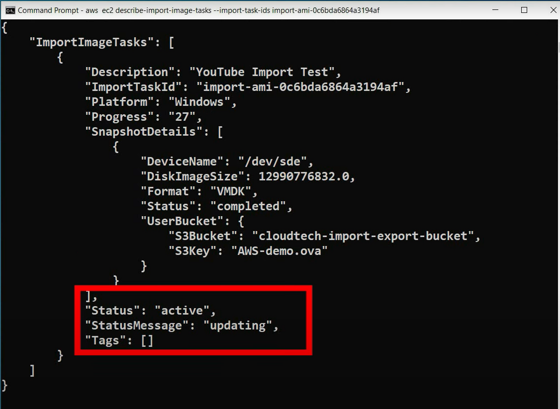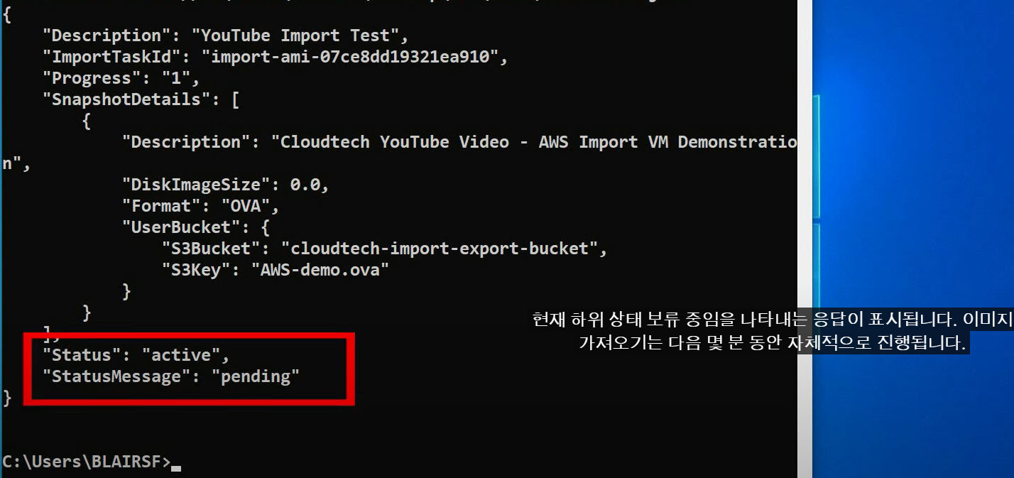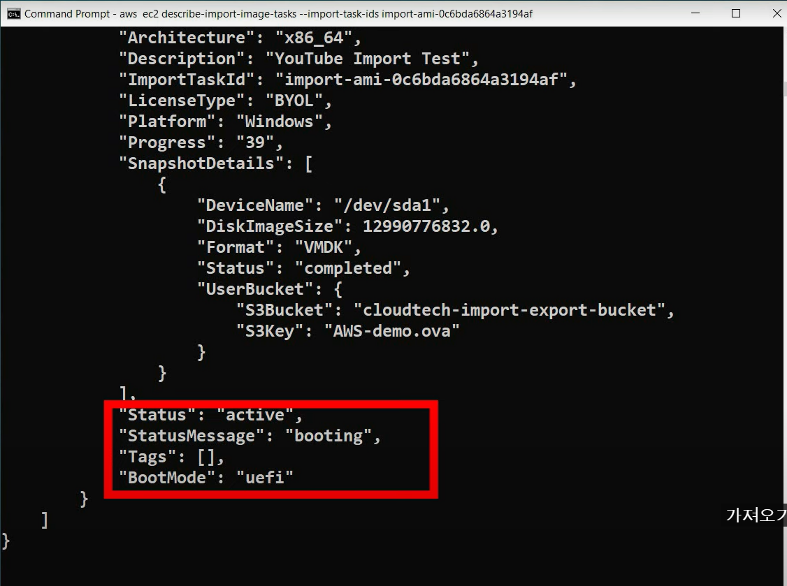 -- describe-import-image-tasks명령을 사용하여 가져오기 작업의 상태를 반환합니다.