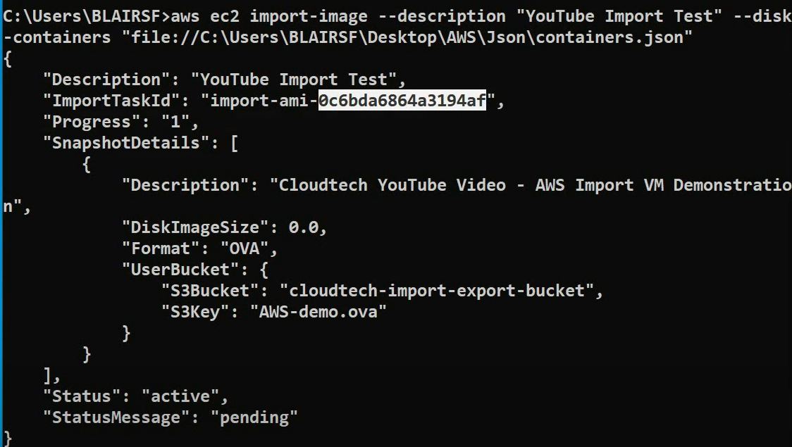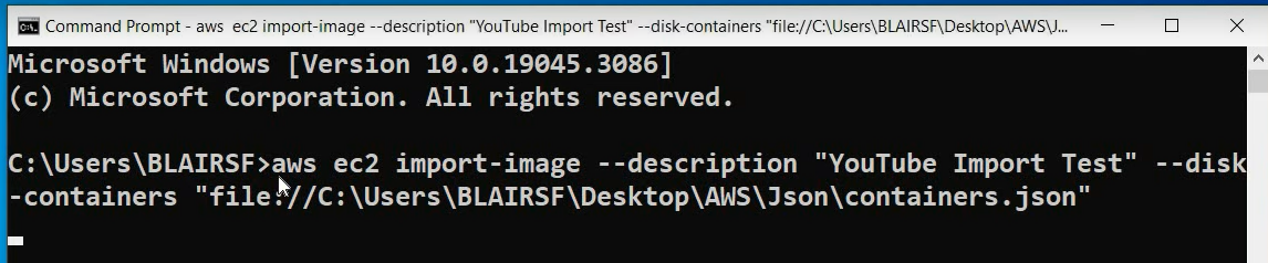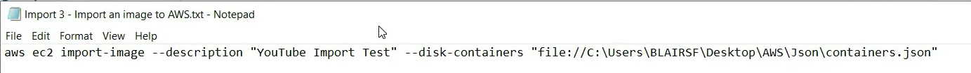 aws ec2 import-image --description "My server VM" --disk-containers "file://C:\import\containers.json"