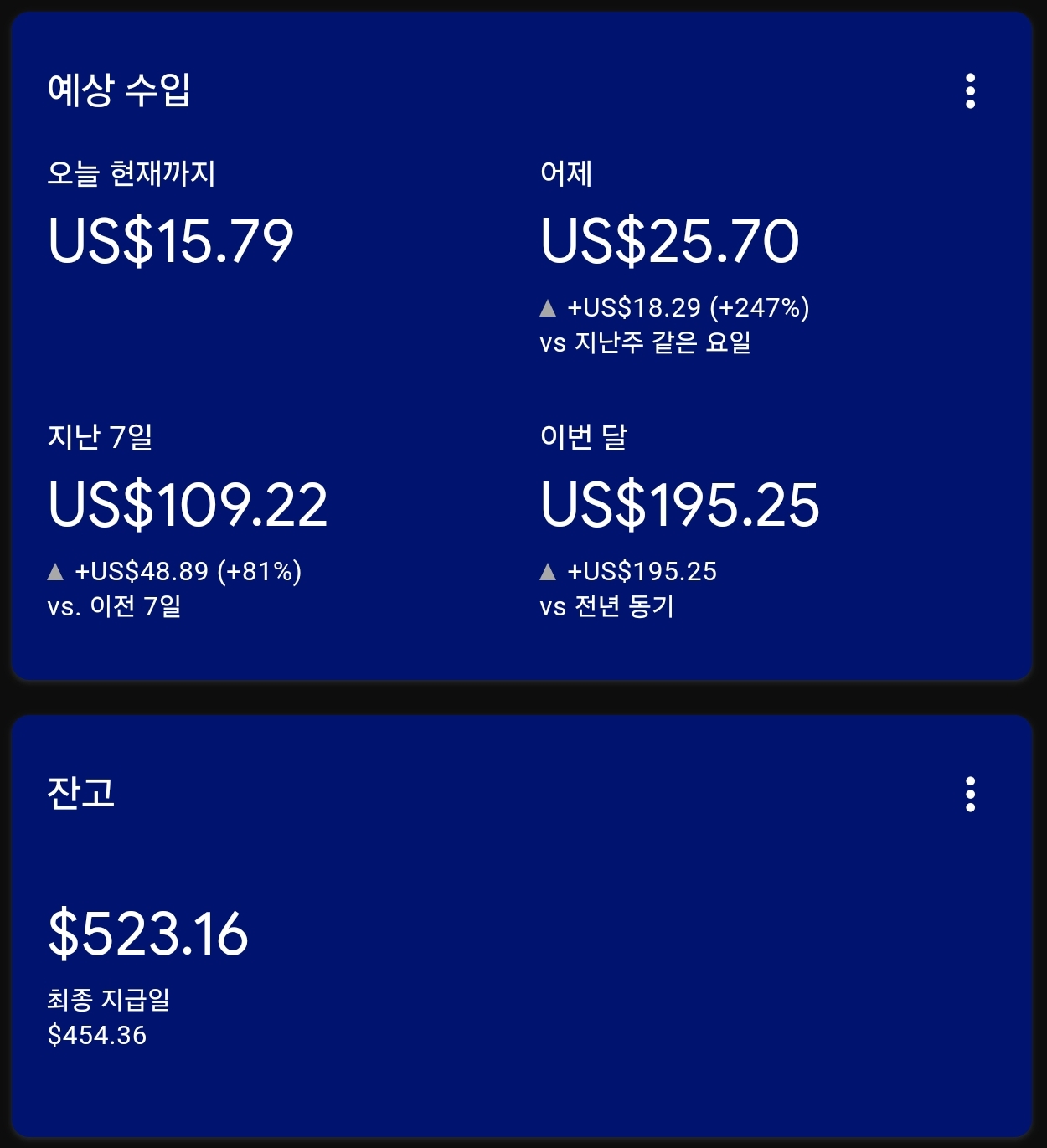 | [인터넷건물주 - 5월 월세] US $353 돌파 - AdSense 5/22일!! (64) | 2024.05.23 |
