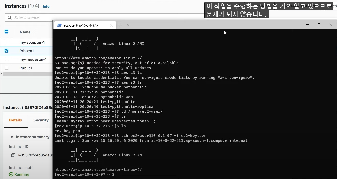 - 프라이빗 EC2 라서 IAM 역할을 부여해도 통신 불가