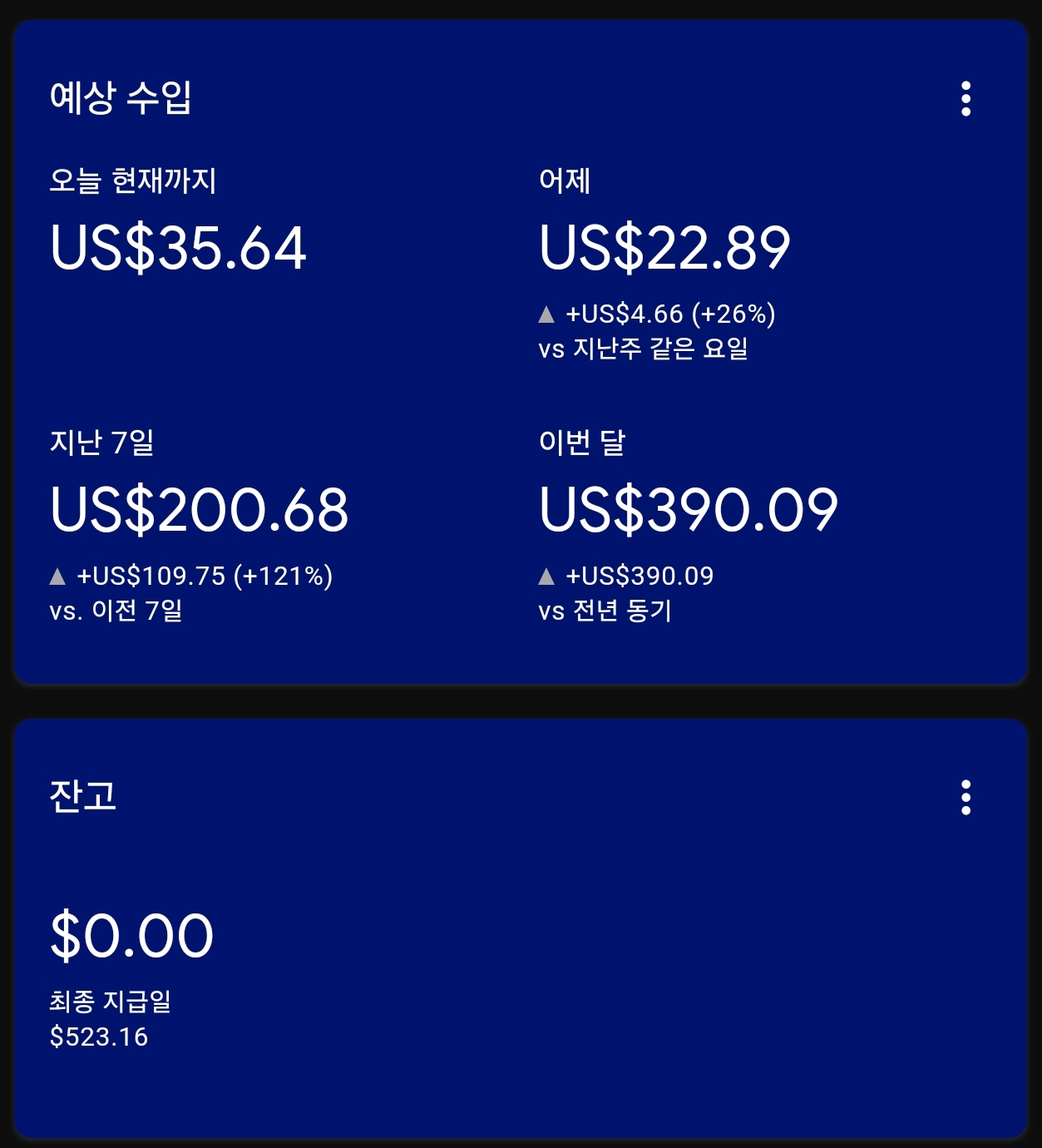 | [인터넷건물주 - 5월 월세] US $428 돌파 - AdSense 5/24일!! (70) | 2024.05.24 |
