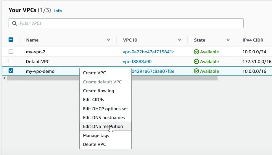 ## 테스트를 위한 my-vpc-demo ==> (DHCP 옵션 활성화)