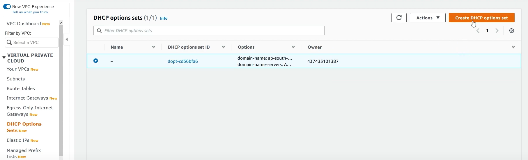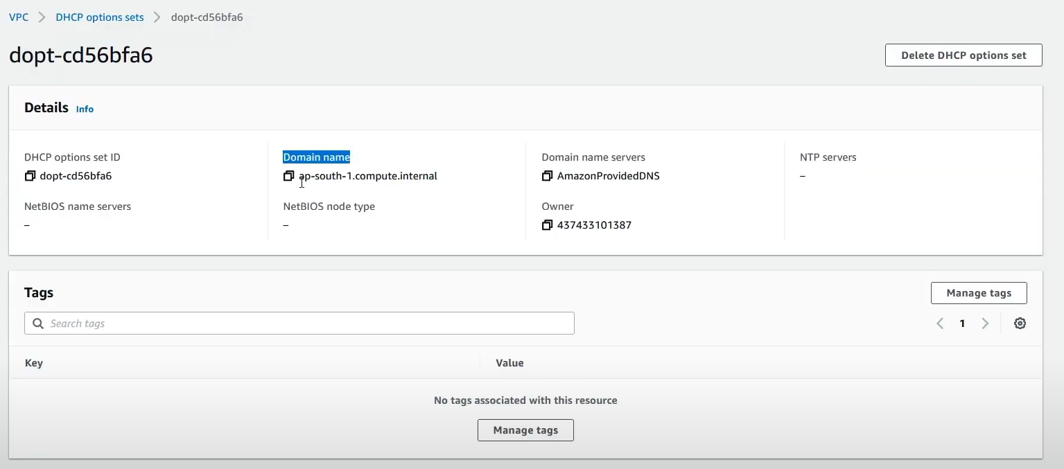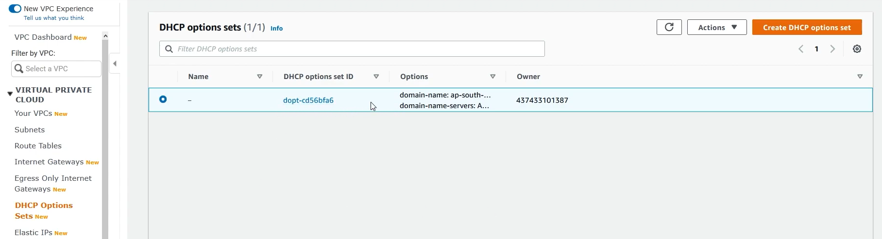 ## DHCP 옵션세트 확인 (그 이후에 생성되는 모든 VPC와 연결됨)