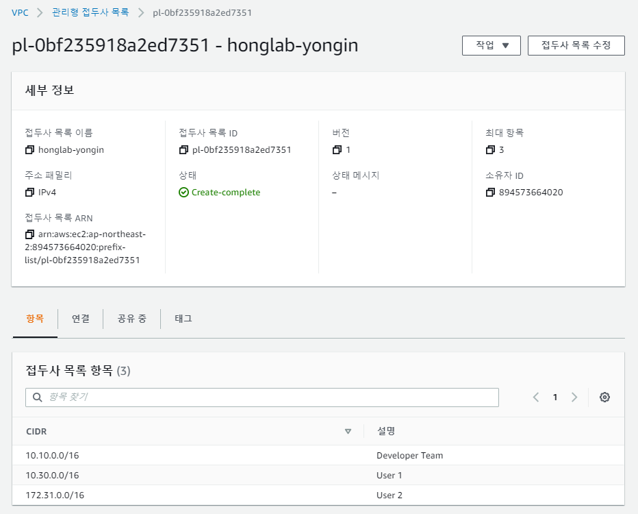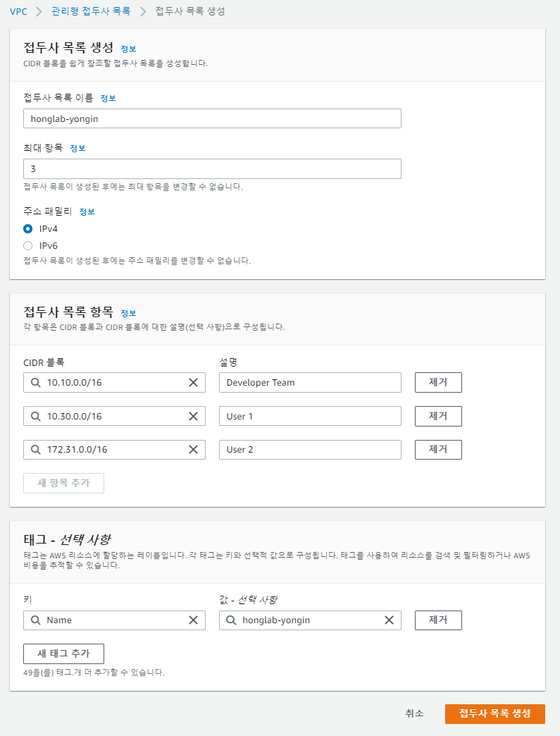 AWS Console > VPC > 관리형 접두사 목록(Managed Prefix list)