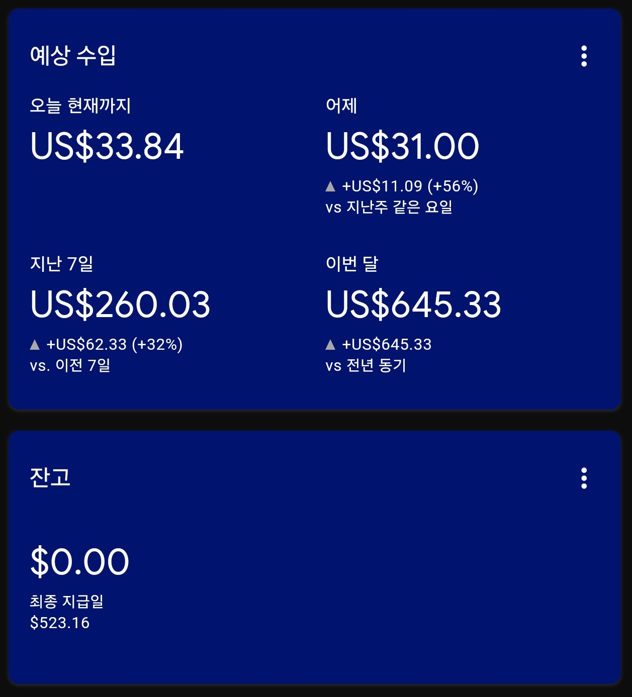 | [인터넷건물주 - 5월 월세] US $524 돌파 - AdSense 5/27일!! (56) | 2024.05.27 |