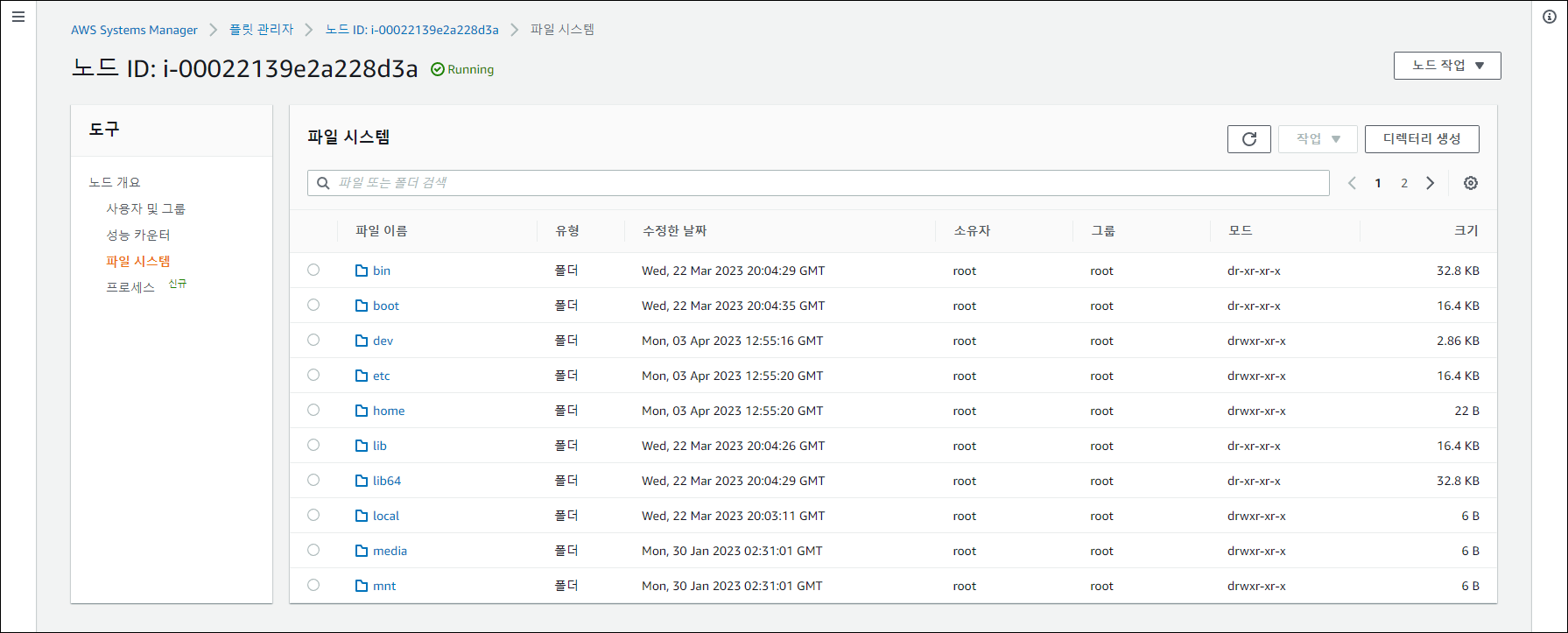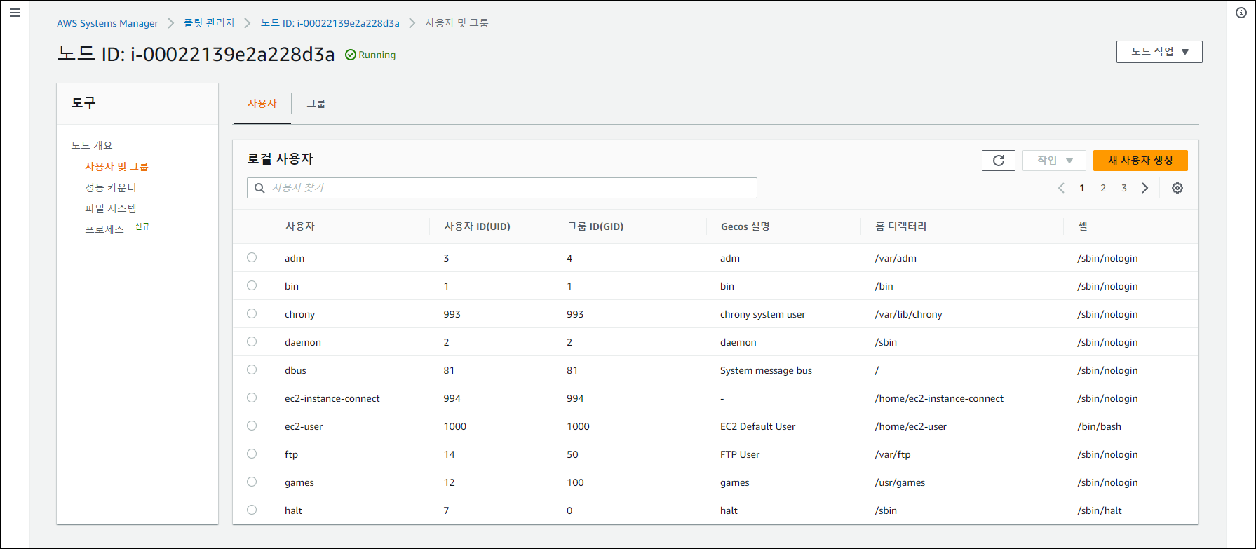 또한 존재하는 '노드 ID' 를 클릭해보면, 해당 인스턴스의 상세 정보, 파일 시스템, 사용자 등의 정보를 확인 가능하다.