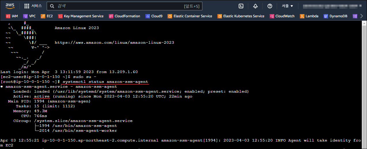 명령어를 통해 SSM 에이전트가 실행 중임을 확인하였다.