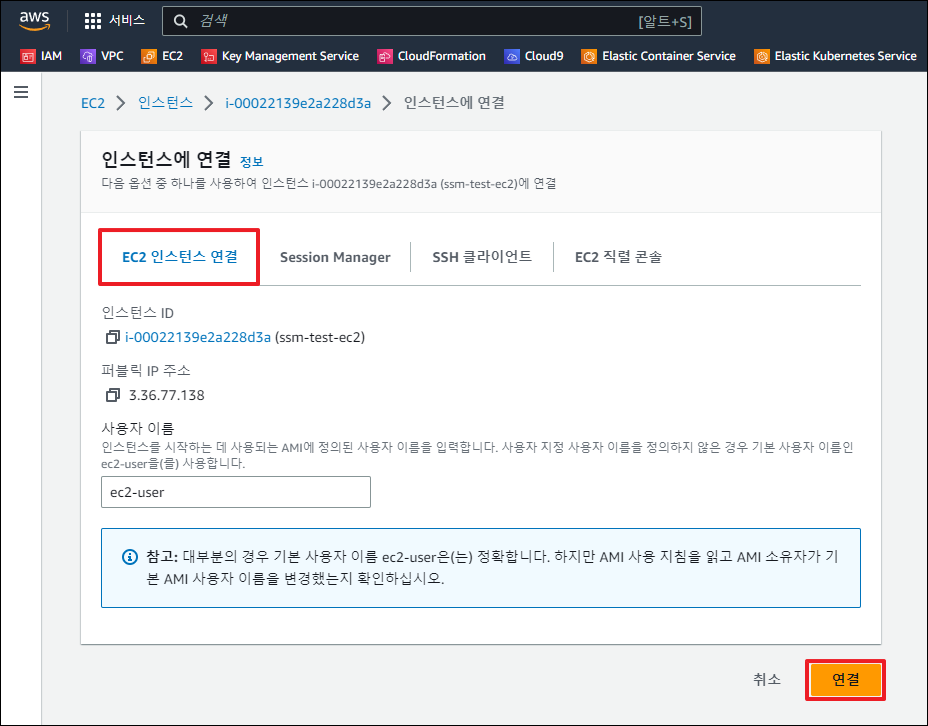 아래와 같이 실행중인 EC2 인스턴스에 'EC2 인스턴스 연결' 방법을 이용하여 접속한다.