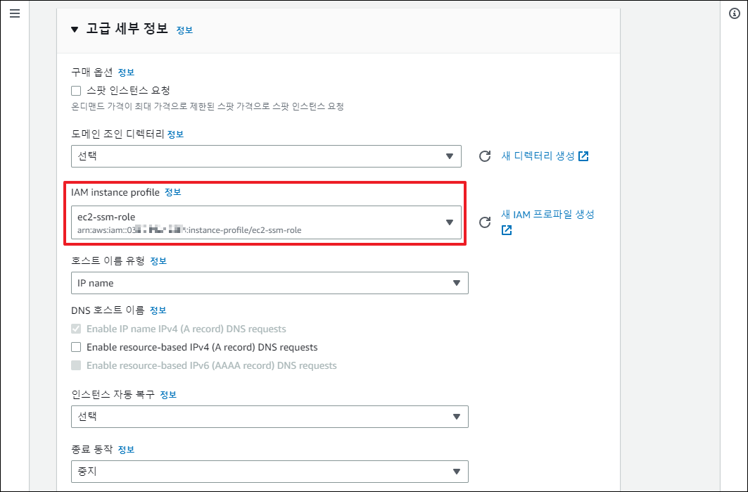 AmazonSSMManagedInstanceCore 정책이 IAM 역할로 부여되어 있어야함