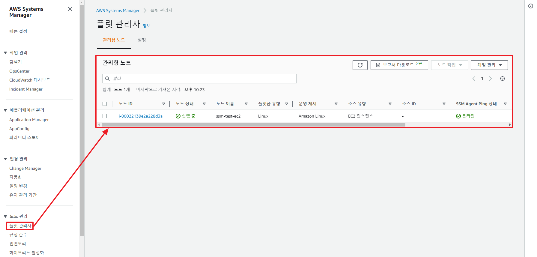 AWS SSM과 SSM 에이전트가 설치된 EC2 인스턴스 간 정상적으로 연결되었는지 여부는 'AWS Systems Manager' 서비스 - [플릿 관리자] 에서 확인할 수 있다.