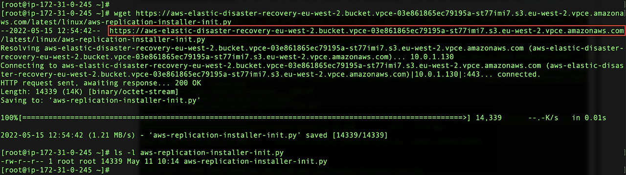 The connection is established with the regional API endpoints via the interface endpoints. You can now install the Elastic Disaster Recovery replication agent. To install the replication agent on the source server, first download it using the eu-west-2 URL of the installer. However, in theory, you can use the installer of any Region. First, modify the URL of the installer by replacing the .s3.amazonaws.com with the Amazon S3 endpoint-specific DNS name (i.e.,vpce-03e861865ec79195a-st77imi7.s3.eu-west-2.vpce.amazonaws.com). Also, you must add the bucket to the URL as well so that you are able to access it. The URL of the installer becomes https://aws-elastic-disaster-recovery-eu-west-2.bucket.vpce-03e861865ec79195a-st77imi7.s3.eu-west-2.vpce.amazonaws.com/latest/linux/aws-replication-installer-init.py.