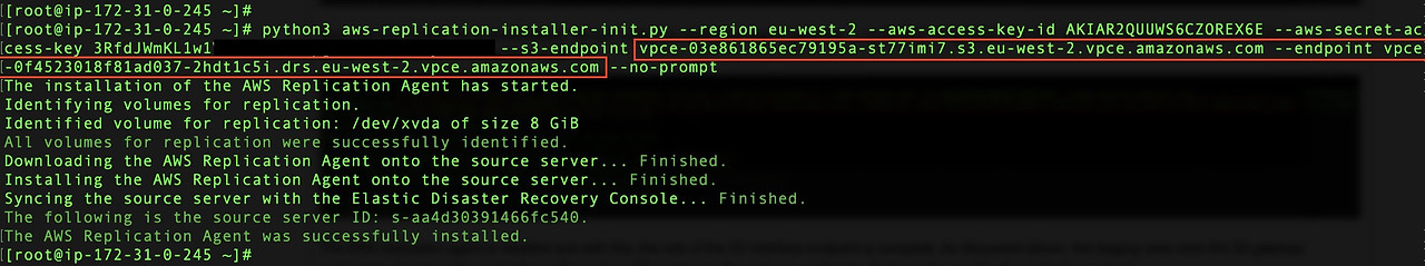 Now that the installer file is downloaded, install the replication agent using the --endpoint to specify the Elastic Disaster Recovery VPC Interface endpoint. Use --s3-endpoint to reflect the use of the Amazon S3 VPC interface endpoint.