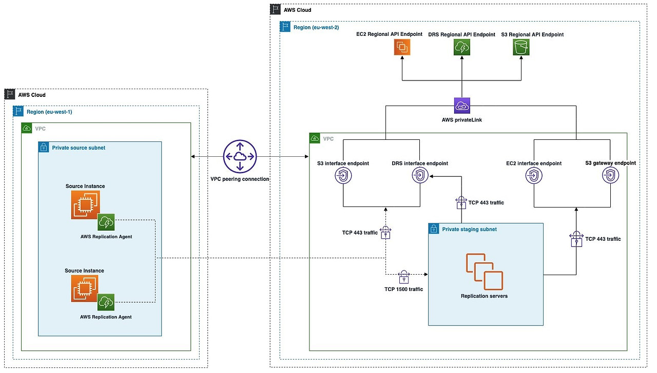 For the purposes of this post, the Amazon Elastic Compute Cloud (EC2) instance we replicate and protect is running in a secured VPC in eu-west-1 Region to eu-west-2 Region. The VPC in both Regions is tightly secured and doesn’t have internet access. The two VPCs in this demonstration are connected with a VPC peering connection.