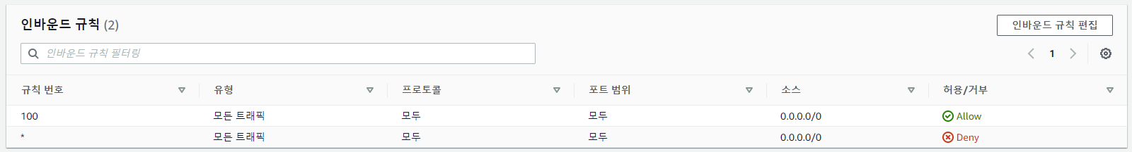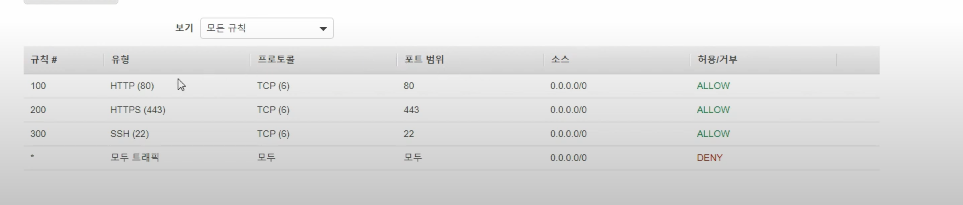 숫자가 낮을수록 우선 적용이 되며 위의 경우에는 100번의 규칙 번호를 가진 모든 트래픽을 허용하는 것이 기본적인 원칙으로 되어 있다.