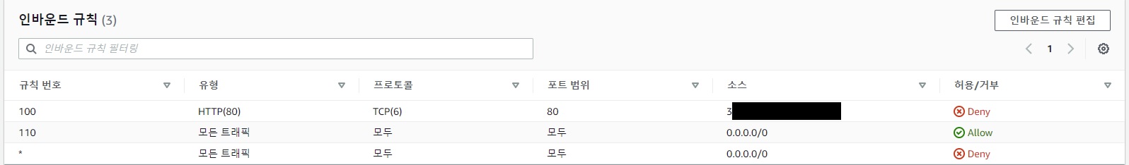 이후 Inbound 규칙에 규칙 번호를 모든 트래픽 허용보다 낮은 숫자로 잡은 후 Deny를 걸어 보았다.