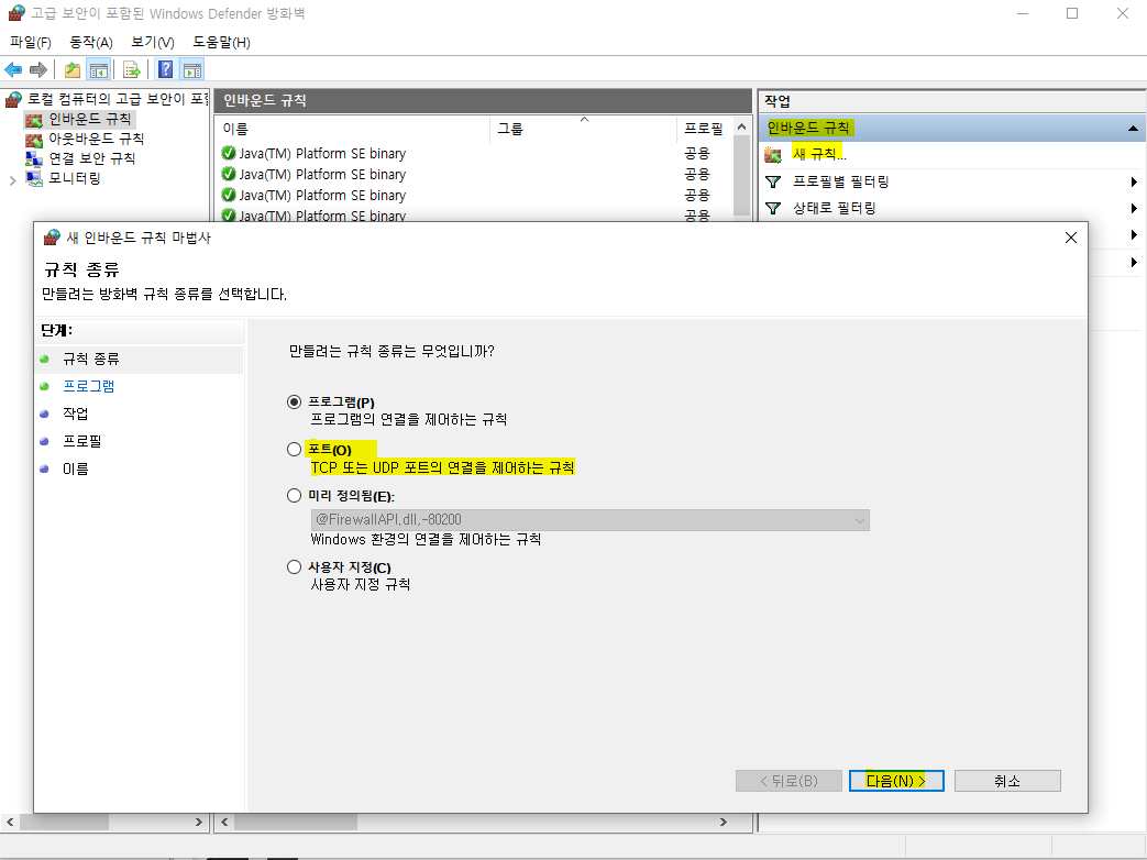 (제어판 -> Windows 방화벽 -> 고급설정)