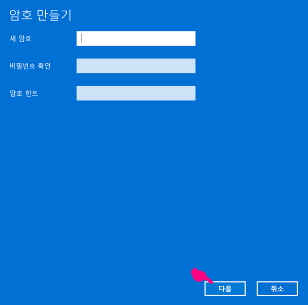 '암호'아래 '추가'를 클릭하면 아래의 창이 뜨는데, 이때 내가 원하는 암호를 두번 넣어주고 암호 힌트까지 넣어주면 새로운 암호가 생긴다. 그리고 이 암호 설정창을 공백으로 해두면 있던 암호가 없어진다.