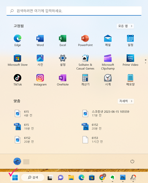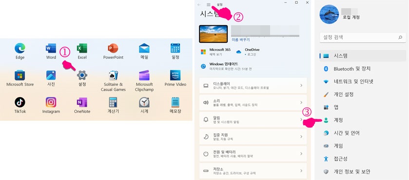 컴퓨터의 설정을 변경하려면 아래 1번 그림처럼 수레바퀴 모양의 그림을 찾아야 한다. 윈도우 10 이전에는 윈도우 화면 아랫부분 작업 표시줄 맨 왼쪽에 전원 버튼을 누르면 전원 버튼과 함께 수레바퀴 모양의 설정창이 나타났었는데, 윈도우 11에서는 아래 작업 표시줄 중앙에 윈도우 버튼을 눌러줘야 한다.