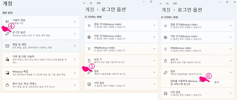 같은 화면 맨 위에 보이는 검색창에 '로그인 옵션'이나 '암호'를 입력해 주면 내가 원하는 작업을 위한 창을 열 수 있다.