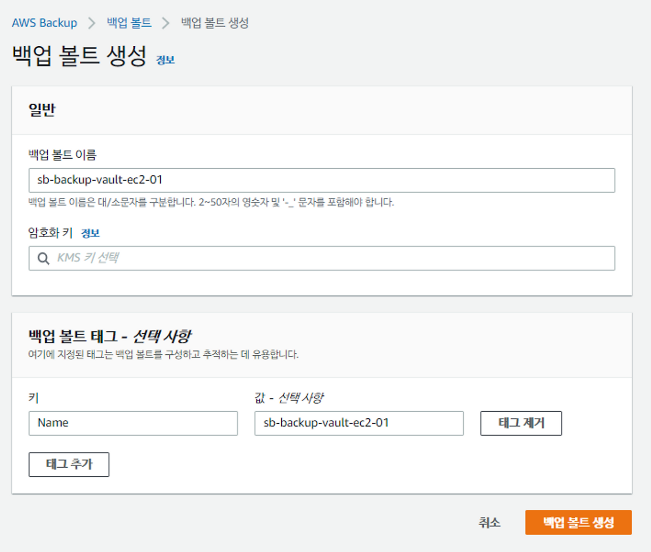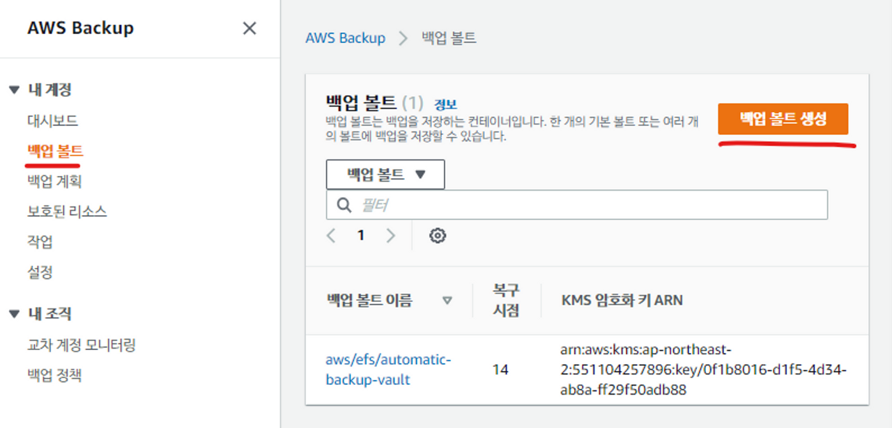 백업을 생성하기 위해서는 우선 백업 볼트를 생성한다.